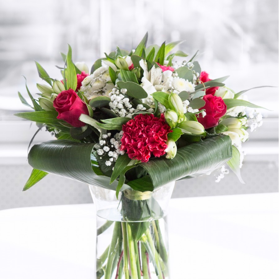 Discover the charm and elegance of our Charming Blooms Collection. This bouquet features a vibrant mix of red roses, white chrysanthemums, carnations, and gypsophila, expertly arranged with white alstroemeria and aspidistra leaves.