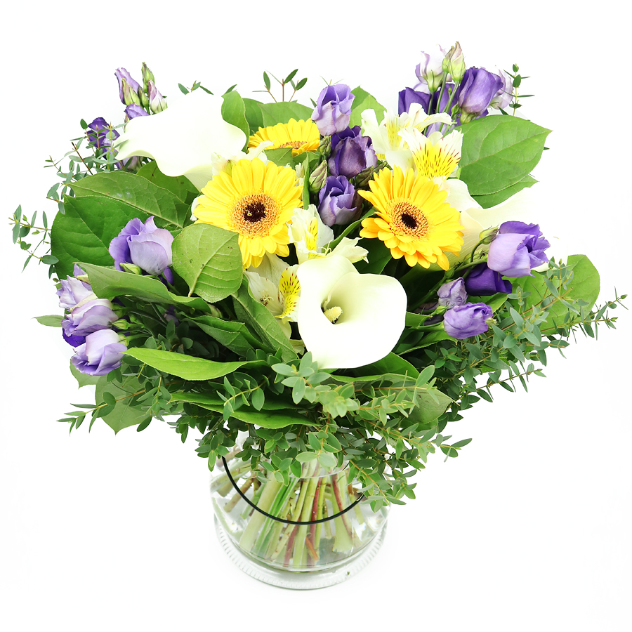 Brighten someone's day with our luxurious multi-flower bouquet. Featuring white calla lilies, yellow gerberas, purple lisianthus, and rich greenery, this arrangement is designed to impress with its vibrant colors and elegant design.